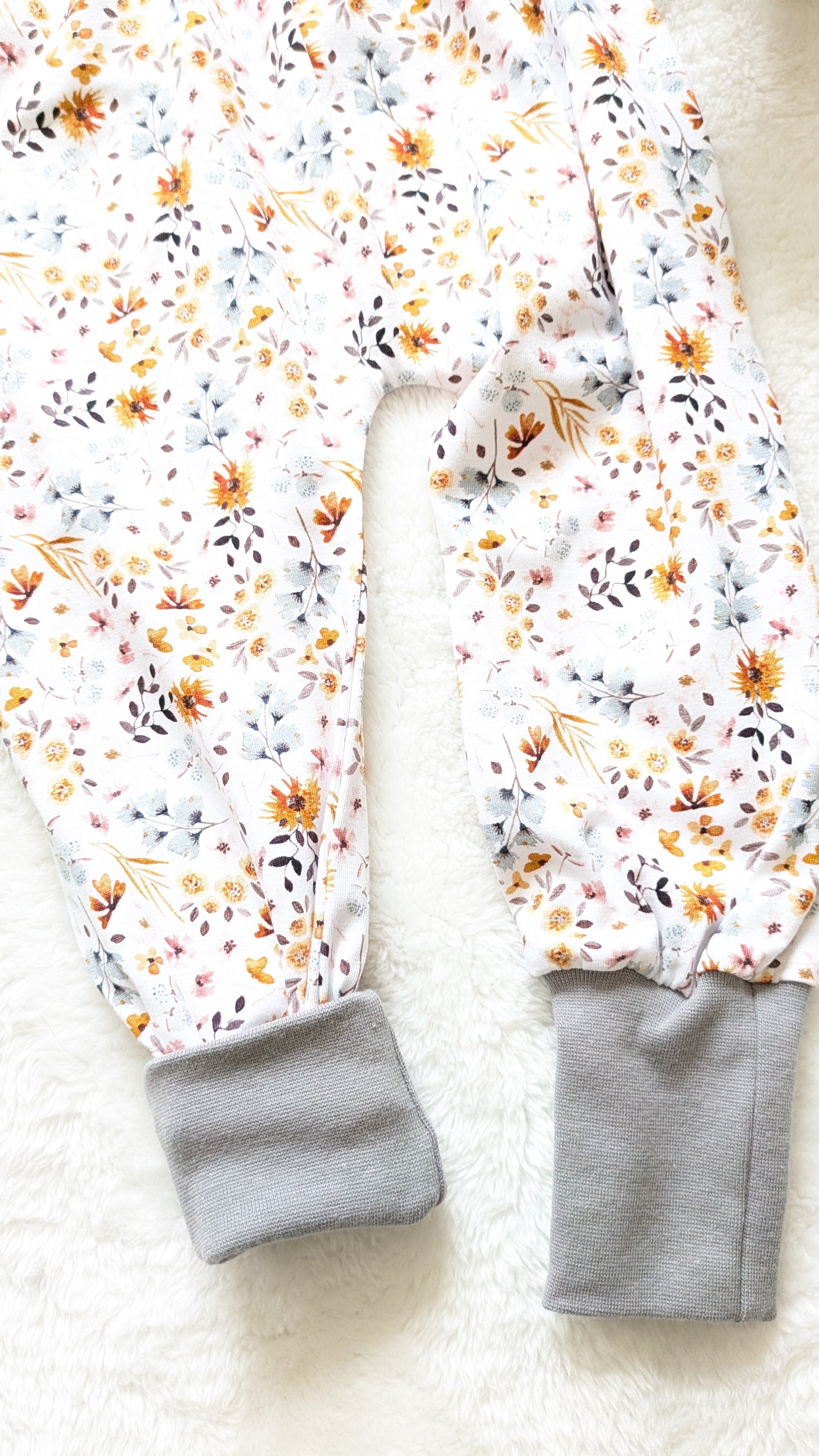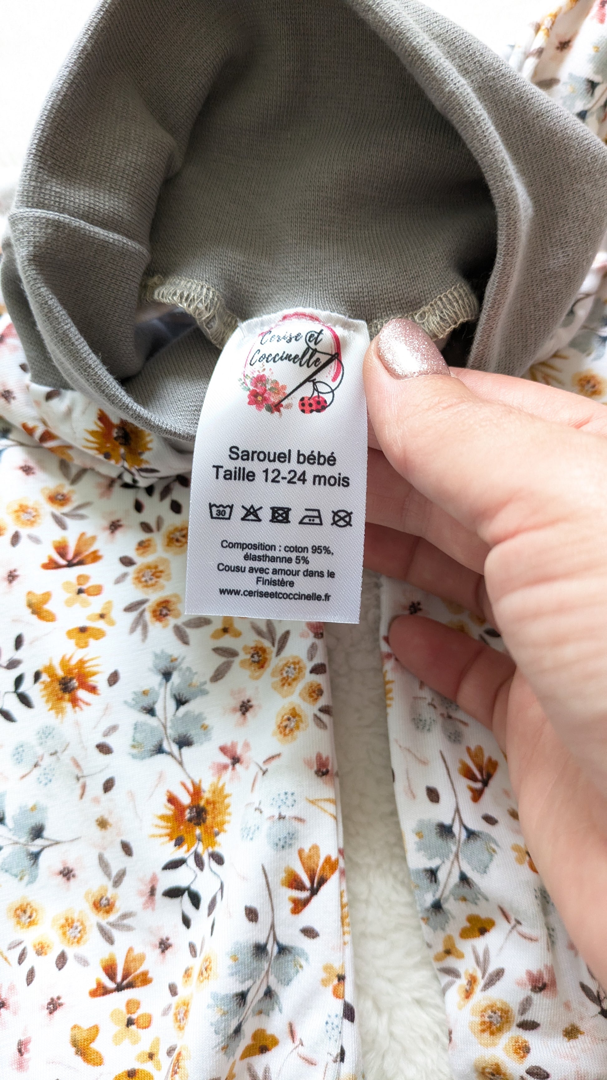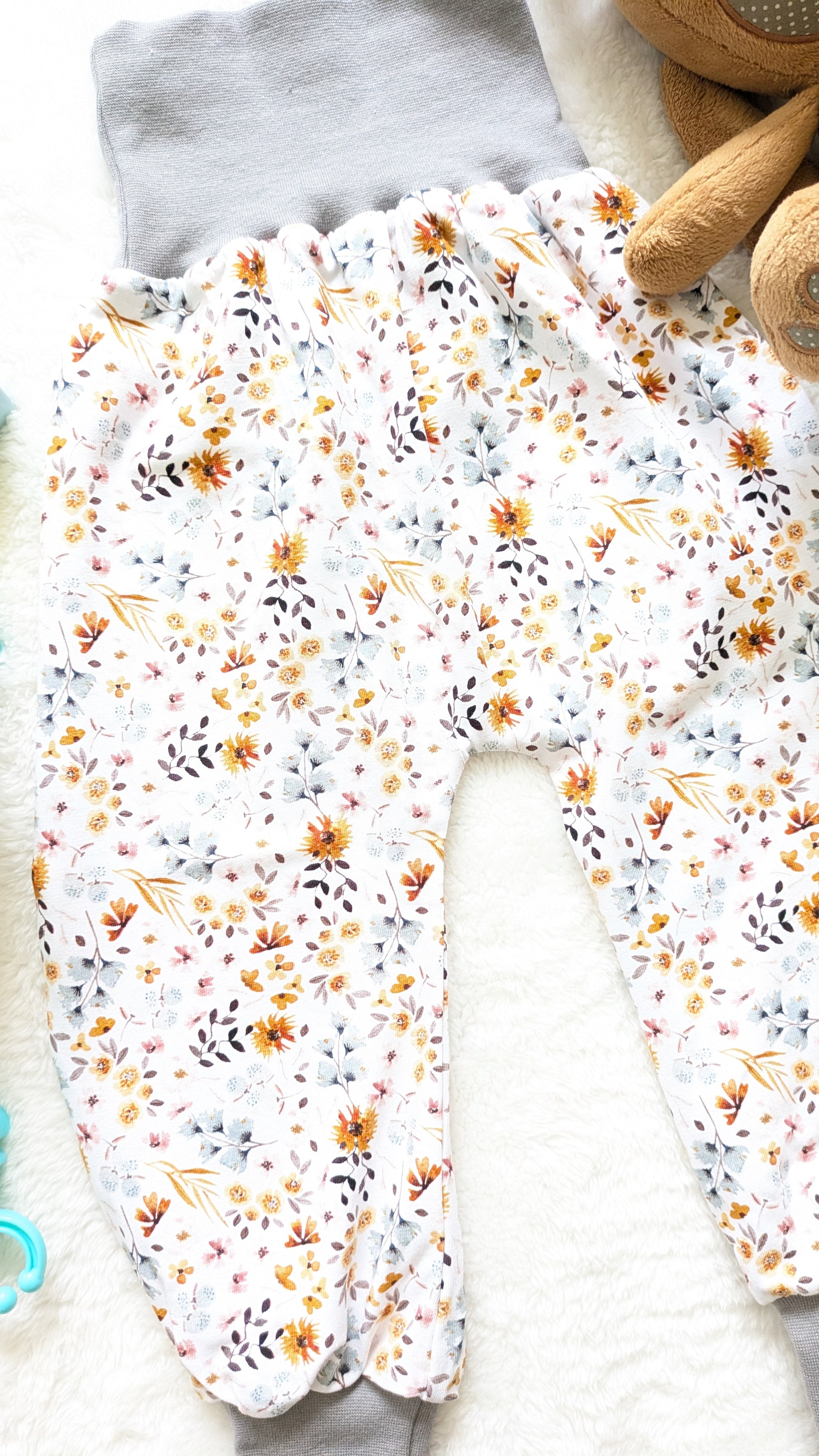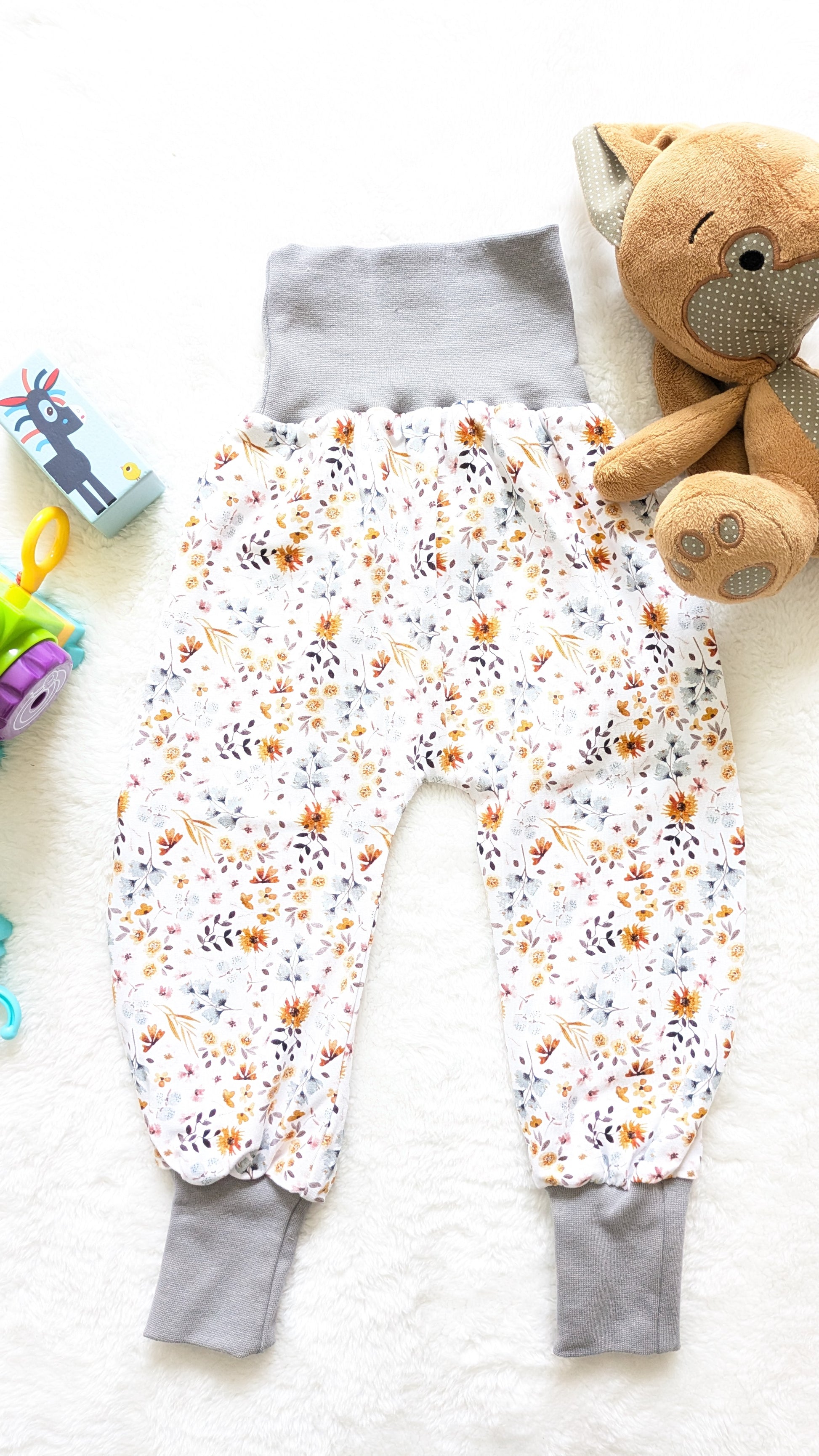 Pourquoi j'aime tant les sarouels ? Parce qu'ils sont évolutifs grâce aux bandes de tissu jersey en bas des pieds, vous pouvez adapter la taille et donc pas besoin d'acheter beaucoup de pantalons ou de collants en fonction de la taille de votre bébé. En plus, bébé peut bouger librement et il n'est pas serré dedans.